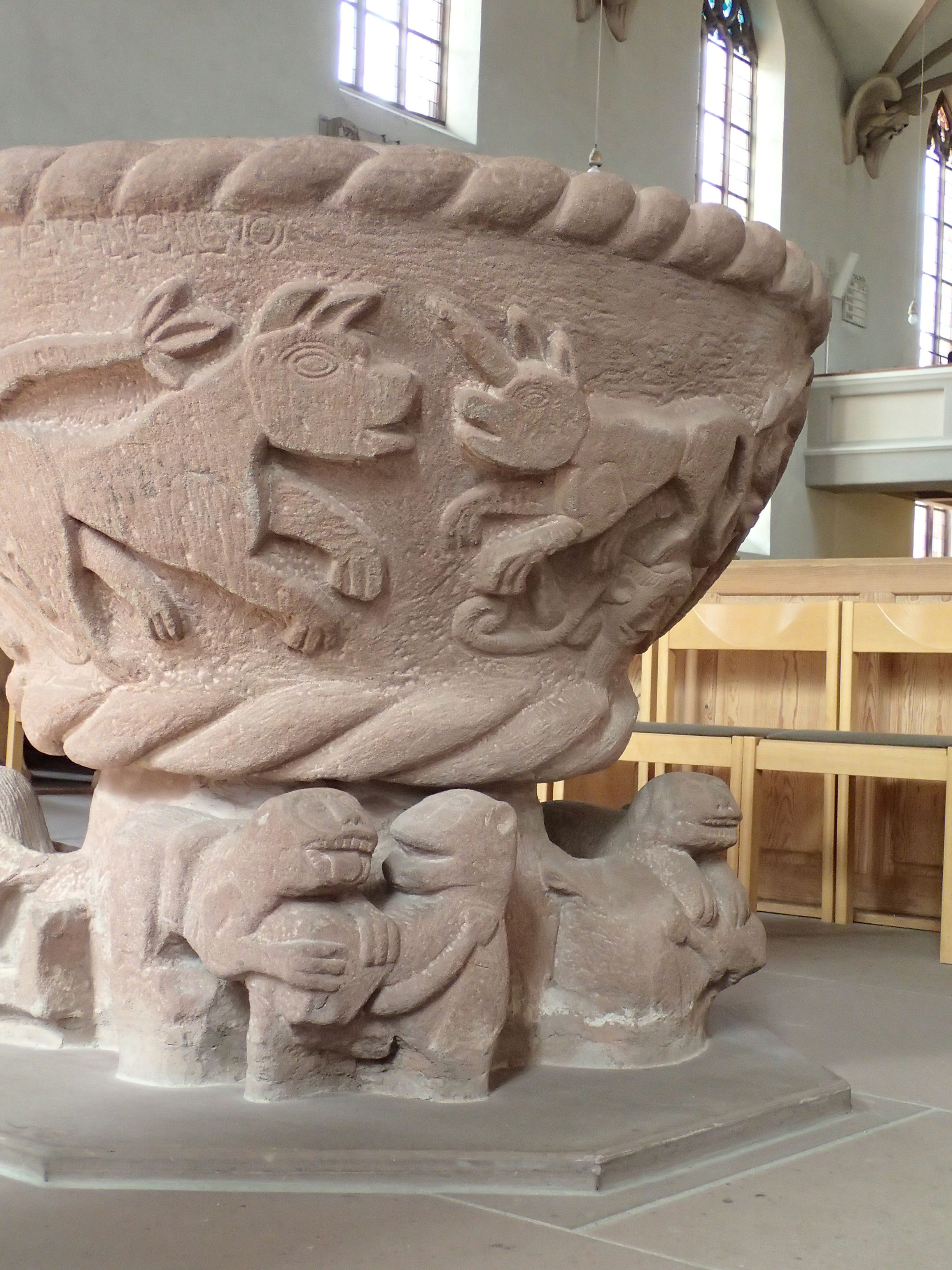 In der romanischen Epoche werden Tierdarstellungen zunehmend wichtig und zeigen sich zunächst an dem im 11. Jahrhundert entstandenen Taufstein der Stadtkirche von Freudenstadt, treten dann aber auch vermehrt an einzelnen Kirchenbauten als Schmuckformen auf. So sind sie beispielsweise am Fries des Hirsauer Eulenturms und an der Gmünder Johanniskirche zu finden und treten dann auch noch in der spätromanischen Epoche an Rundbogenfriesen, Gesimsen und Portalen auf.(40)