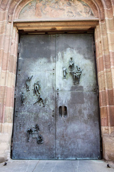 Ferner sei auch ein Blick auf die Verzierung der Portale geworfen, die im 19. Jahrhundert noch sehr traditionell als Rundbogen- oder Spitzbogenportale ausgeführt wurden, dann eine Rahmenform in Gestalt von Säulen mit bekrönendem Tympanon erhielten, das dann meist mit einem Relief ausgeschmückt wurde. Erst im Verlauf des 20. Jahrhundert ändert sich die Gestalt der Portale, die Rahmenform ist oft fortgelassen, dafür ist aber die Portalfläche selbst figürlich gestaltet. Dies wird zunehmend auch auf Portale von mittelalterlichen Kirchen übertragen, wie man beispielsweise anhand des Westportals der Stadtkirche in Bad Cannstatt, das 1962 von Gottfried Henn mit einem Bronzeguss verziert wurde, deutlich sehen kann.(76) Das zweiflügelige hochrechteckige Westportal zeigt das Gleichnis von den Arbeitern im Weinberg, das in Matth. 20, Vers 1-16 berichtet wird. In diesem Gleichnis wird das Reich Gottes mit einem Hausherrn verglichen, der Tag für Tag zur Versorgung seines Weinbergs Arbeiter für einen Lohn eines Denars einstellt. Der Weinbergbesitzer geht alle drei Stunden auf den Marktplatz, um neue Arbeiter anzuwerben, die am Ende des Tages alle, egal, wie lange sie gearbeitet haben, einen Denar als Lohn bekommen. Die Arbeiter empfinden das als ungerecht und beschweren sich, doch der Weinbergbesitzer lässt sich nicht beirren, denn er vertritt die Ansicht, dass sie doch für die Arbeit zu einem Denar zugestimmt hätten.