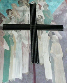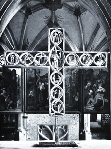 Figurenlos indes bleibt das von Wolf-Dieter Kohler und Gottfried Wendschuh 1965 geschaffene Altarkreuz in der Johanneskirche zu Bernhausen.(73) Das Kreuz besteht aus Eisen und hat die Form eines griechischen Kreuzes. Stamm und Querbalken bestehen aus einer Eisenplatte, auf die in der Senkrechten sechs und in der Waagrechten fünf Metallleisten mit dazwischenliegenden tiefen Kerben aufgelegt sind. Im Kreuzungspunkt zwischen Stamm und Querbalken sind nur zwei der horizontalen Leisten über die senkrechten gelegt, bei den übrigen laufen die vertikalen Leisten durch und die horizontalen brechen ab. Allein durch die rückwärtige Wandbemalung wird das Kreuz belebt, in der Menschen dargestellt sind, die entweder paar- oder gruppenweise mit erstaunten Blicken und Gebärden auf das Kreuz blicken.