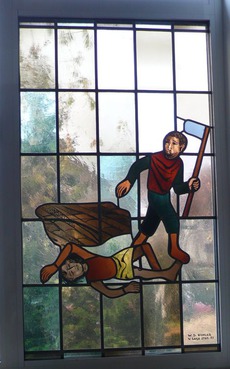 Bernhausen, Johanneskirche. Fenster der Westwand. Kain schlägt Abel tot