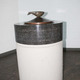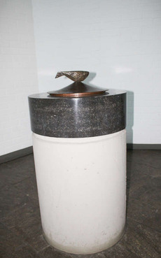Demgegenüber zeigt der Taufstein der Fellbacher Melanchthonkirche von 1962/1964 eine gänzlich schlichte, wiederum der Gestalt des Innenraumes entsprechend nüchterne Form, allein bestehend aus einem sehr hohen zylinderförmigen Sockel aus Sichtbeton, der mit einer umlaufenden Kerbe schließt.(75) Darüber erhebt sich der Korpus aus schwarzem Marmor, der nur ein Drittel der Höhe des Sockels, aber denselben Radius wie der Sockel aufweist. Die Oberseite des Korpus ist zum Einstellen einer Taufschale eingetieft. Diese besteht aus Kupfer und ist rund und ohne jegliche Zierformen gearbeitet. Allein der trichterförmig nach oben zugespitzte Deckel wird von einem Fisch aus Bronze als Symbol für Christus bekrönt. Wenn man die Schale mit Deckel in die Vertiefung des Taufsteins stellt, ist lediglich der Deckel zu erkennen, der quasi als Bekrönung des Taufsteins fungiert, so dass der Betrachter, der den Taufstein in Augenschein nimmt, zunächst den Fisch wahrnimmt.