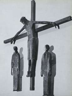 Auch die von Karl Hemmeter Ende der 50er/Anfang der 60er Jahre des 20. Jahrhunderts geschaffene Kreuzigungsgruppe für die Auferstehungskirche in Heilbronn(69) nimmt weniger den Tod als vielmehr das Leben Jesu Christi in den Blick. Obschon der Gekreuzigte sehr schmal ist und mit langen Armen und Beinen, einem langen Oberkörper und einem langgezogenen ovalen Kopf dargestellt ist, so als sei er leicht überstreckt ans Kreuz genagelt, befindet sich der Kopf von Christus nicht unterhalb des Schnittpunktes von Stamm und Querbalken, sondern darüber, so dass die Arme nicht nach unten, sondern nach oben durchgestreckt sind. Christus blickt auf die links unter ihm befindliche Maria herab und da er sich mit dem Kopf leicht nach vorne beugt, erzeugt diese Gebärde den Eindruck, als löse er sich schon leicht vom Kreuz, wodurch die Auferstehung schon im Tod mit eingeschlossen ist. Hinzu tritt, dass die Physiognomie des Gekreuzigten im Gegensatz zum Körper deutlich artikuliert ist, denn die Augenbrauen sind stark hochgezogen, die lange Nase steht im Kontrast zur vorgeschobenen und vorgewölbten Unterlippe, die deutlich erkennen lässt, dass er nun über das überwundene Leid erleichtert ist und hingebungsvoll zu seiner Mutter blickt.