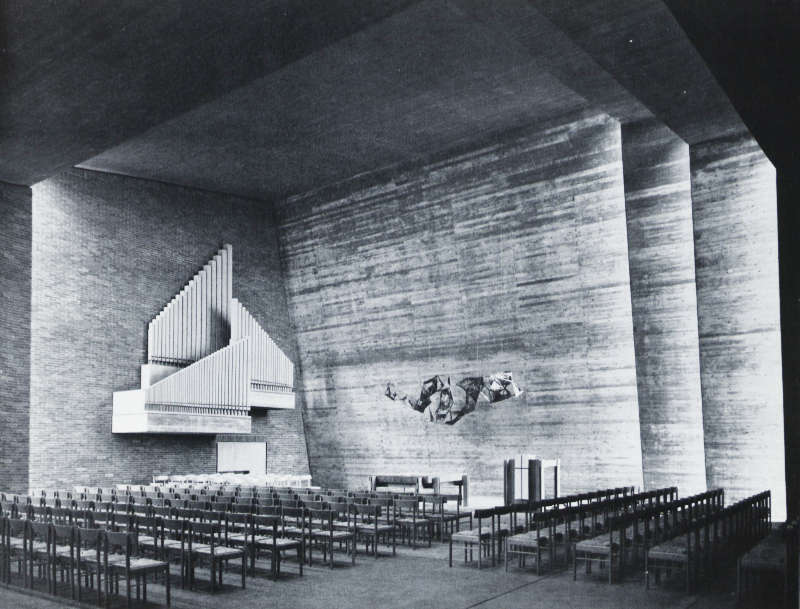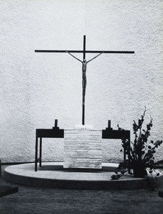 Eben gerade aufgrund dieser Überlegungen setzte sich das Wiesbadener Programm auch in Württemberg spätestens nach dem Zweiten Weltkrieg endgültig durch.(32) In der Zeit zwischen 1957 und 1966 entstanden nun neue Kirchenbauten mit deutlicher Tendenz zum kirchlichen Gemeindezentrum mit einem differenzierten Raumprogramm, das neben der Kirche in der Regel einen Gemeinderaum, Clubräume für Jugendliche und Erwachsene, Kindergarten und Wohnungen für kirchliche Mitarbeiterinnen und Mitarbeiter umfasst.(33) In diesen neuen Baukonzeptionen, die den Wandel von der Sonntagskirche zur Alltagskirche dokumentieren, wird die Verflechtung kirchlicher Einrichtungen mit dem öffentlichen Leben, und zwar sowohl hinsichtlich des sozialen Engagements als auch der Freizeitgestaltung, offenkundig.(34) Gemeinde und Altarbereich rücken einander näher, die Prinzipalstücke werden ohne Trennung in die Versammlung der Gemeinde einbezogen. Aufgrund dieser liturgischen Grundprinzipien werden die Räume breiter, starre Symmetrie und axiale Ausrichtung des Kirchenraumes werden vermieden, Grund- und Aufriss werden unter Einbeziehung plastischer Wandflächen und Öffnungen vollkommen frei gestaltet. Ziel dieser offenen Konzeption ist eine räumliche Durchbildung mit differenzierter Lichtführung, die mit raffinierten Gestaltungsmitteln eine auffallende Tendenz zur Monumentalität und Feierlichkeit zugleich aufweist.(35) Die Kirchen sind nun Festräume des Wortes(36), ihre Sakralität ergibt sich durch die vielfältigen architektonischen Gestaltungsmittel, die jeden Kirchenbau zu einem individuellen Ort der Gottesdienstfeier machen. Da der Kirchenbau keine städtebaulich herausragende Funktion mehr erfüllt, gilt es das Bauensemble von Kirche und Gemeindezentrum durch die architektonische Qualität von der Umgebung zu differenzieren, weshalb auch die Verwendung bestimmter Baustoffe immer wichtiger wird. Auch der Kirchturm ist nicht mehr in erster Linie repräsentatives Element, sondern Bauglied, das mehr und mehr als Glockenträger und weniger als Turm verstanden wird.(37)