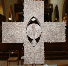 Zehn Jahre später arbeitet auch Hans Gottfried von Stockhausen mit der ausgesparten Form. Sein Tischkreuz in der Schlosskirche St. Jakobus in Winnenden in Gestalt eines griechischen Kreuzes ist in den Binnenflächen mit Laubwerk gefüllt.(72) Im Schnittpunkt zwischen Stamm und Querbalken, im Zentrum des Kreuzes, ist eine Mandorla als ausgesparte Form ausgeschnitten, in die ein rundes Medaillon eingepasst ist. Dieses ist mit einem vorder- und einem rückseitigen Relief verziert, das auf der Vorderseite die Auferstehung und auf der Rückseite die Kreuzigung zeigt. Unter der Mandorla öffnet sich Wurzelwerk zu zwei Ästen, die ihrerseits ein Bergkristall als Symbol für das Gleichnis vom Senfkorn umschließen. Kreuzigung, Auferstehung und Senfkorn vermitteln die Heilsbotschaft von Jesus Christus, der durch den Tod zu neuem Leben gelangte und immer wieder neu Leben schenkt.