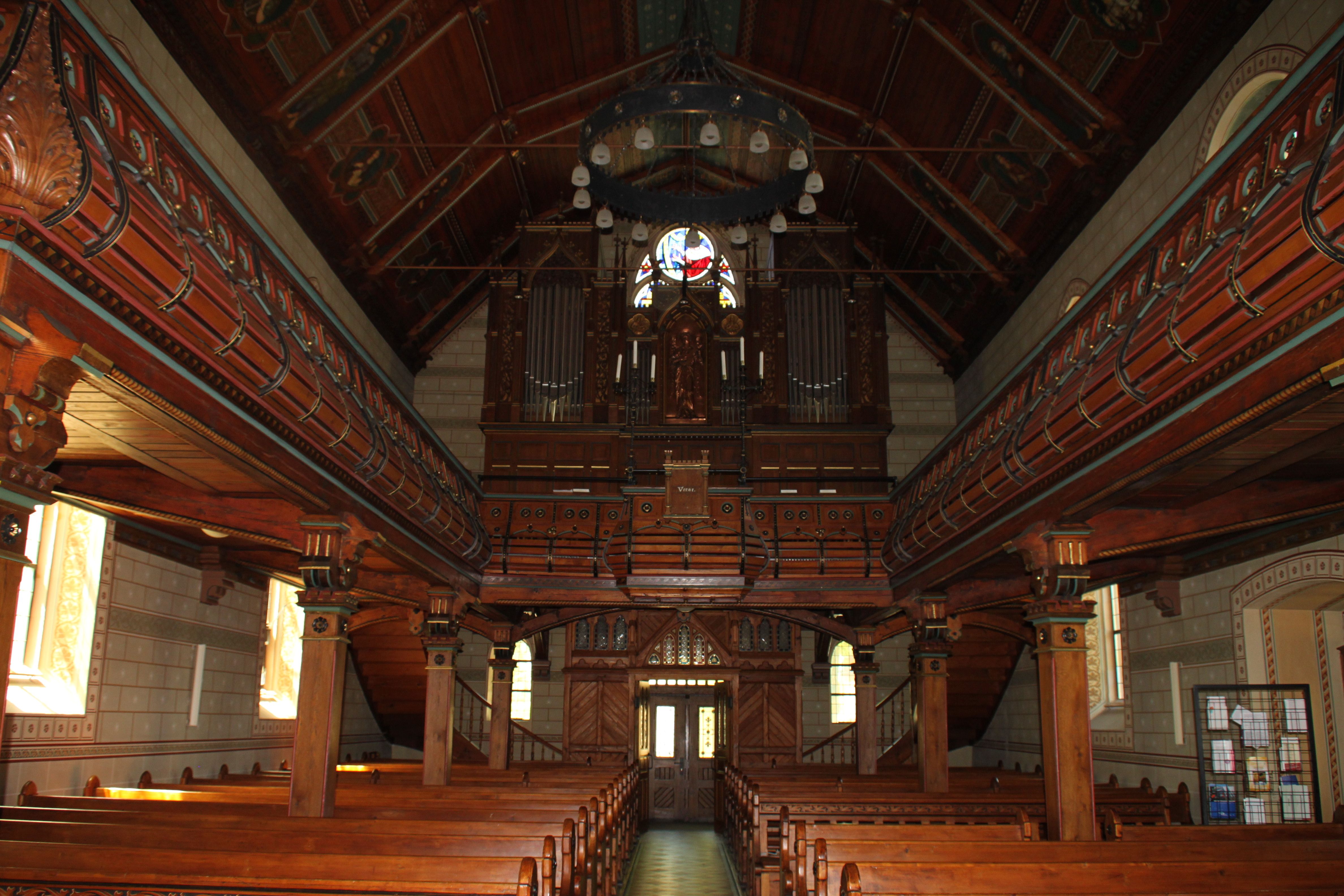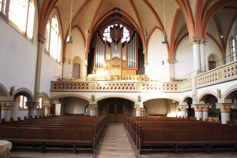 Entsprechend des sog. „Eisenacher Regulativs“ wurde beispielsweise die Lutherkirche in Bad Cannstatt(38) von den Architekten Richard Böklen und Carl Feil 1898-1900 neu erbaut. Der Innenraum ist durch die dreischiffige Anlage mit dem Rechteckchor mit flachem Chorschluss im Osten, dem breiten Mittelschiff und den beiden schmalen Seitenschiffen ungleicher Breite sowie durch die Empore auf der West- und Nordseite geprägt. Im Gegensatz zum Außenbau, der in Backstein ausgeführt wurde, zeigt der Innenraum Kalk- und Sandstein. Der Chor, das Mittelschiff und das nördliche Seitenschiff über den Emporen sind kreuzrippengewölbt, das nördliche Seitenschiff unterhalb der Empore ist pultdachgedeckt und das südliche Seitenschiff zwischen den quer gestellten Rundbögen flachgedeckt. Das Mittelschiff wird einerseits durch die kleinen Fenster des Arkadengeschosses und die breiten und gleichsam hohen Obergadenfenster in Gestalt von spitzbogig schließenden Drillingsfenstern beleuchtet. Die Arkaden zeichnen sich durch den alternierenden Wechsel zwischen einfachen und gekuppelten Rundstützen mit überaus mächtigen Kapitellen aus, auf denen breite Segmentbogen ruhen. Die Emporenbrüstung ist mit Blendmaßwerk verziert. Die gekuppelten Stützen werden im Emporengeschoss in Höhe der Brüstung wieder aufgenommen, hier sind sie indes deutlich höher, denn auf ihnen ruhen die Gurt- und Diagonalbögen sowohl des Haupt- als auch des nördlichen Seitenschiffes. Alle Gliederungselemente des Kirchenraumes sind farbig in den Tönen Grau, Ocker und Rosa gefasst, insbesondere sei hier der Chorbogen erwähnt, der mit einem geometrischen Muster in den Formen des Jugendstils verziert ist. Die Ostseite des Chores ziert ebenso wie die Obergadenfenster eine wiederum spitzbogig schließende Dreifenstergruppe. Der Altar befindet sich im Chor, die Kanzel auf der Südseite des Chorbogens und der Taufstein auf der Langhaussüdseite, vor der Kanzel. Die Orgel auf der Westseite wird demgegenüber von einer großen Rosette hinterfangen, wobei das Orgelprospekt Rücksicht auf die Form der Rosette nimmt.