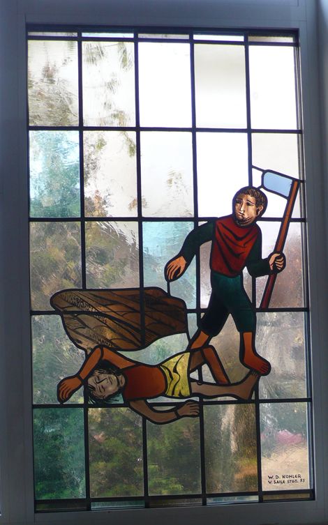 Ferner zeigt die Westwand der Johanneskirche in Bernhausen einen von Walter Kohler 1955 gestalteten Fensterbildzyklus, der in acht verschiedenen Darstellungen die Unheilsgeschichte der Menschheit und die Heilsgeschichte Jesu Christi zum Thema hat.(87) Jedes hochrechteckige Fenster ist dabei in 25 hochrechteckige Felder mit Bleiverglasung unterteilt. Die figürliche Darstellung bezieht sich im Wesentlichen nur auf bestimmte Felder des jeweiligen Glasfensters, keinesfalls jedoch auf alle. Bei der ersten Illustration des Zyklus mit Darstellung vom Brudermord Kains liegt Abel leblos auf dem Boden, während Kain mit der Axt in der Hand vor ihm wegläuft, sich aber noch erschrocken nach ihm umsieht. Die Szene ist gänzlich auf die Gebärden und Gesten der beiden Figuren reduziert, denn ein Hintergrund ist lediglich hinter Abel in Gestalt eines braunen Fußbodens angedeutet, ansonsten wird auf die Ausgestaltung des Bildvorder- und -hintergrundes vollkommen verzichtet.