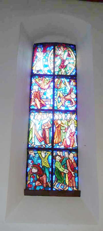 Die Dramaturgie der Gebärden und Gesten zeigt sich auch in den von Valentin Saile 1954 gestalteten Chorfenstern der Pfarrkirche in Erkenbrechtsweiler, die segmentbogenförmig schließen und in sechs bzw. acht, jeweils paarweise angeordneten Feldern aus farbigem Glas Darstellungen mit biblischen Geschichten und Szenen aus dem Leben Jesu zeigen.(88) Die Szenen spielen sich alle vor blauem Hintergrund ab, wodurch die Figuren mit roten, grünen oder ockerfarbenen Gewändern, die meist in Gruppen angeordnet sind und sich mal die Hände reichen, sich mal nach vorn oder nach hinten beugen, deutlich hervortreten.