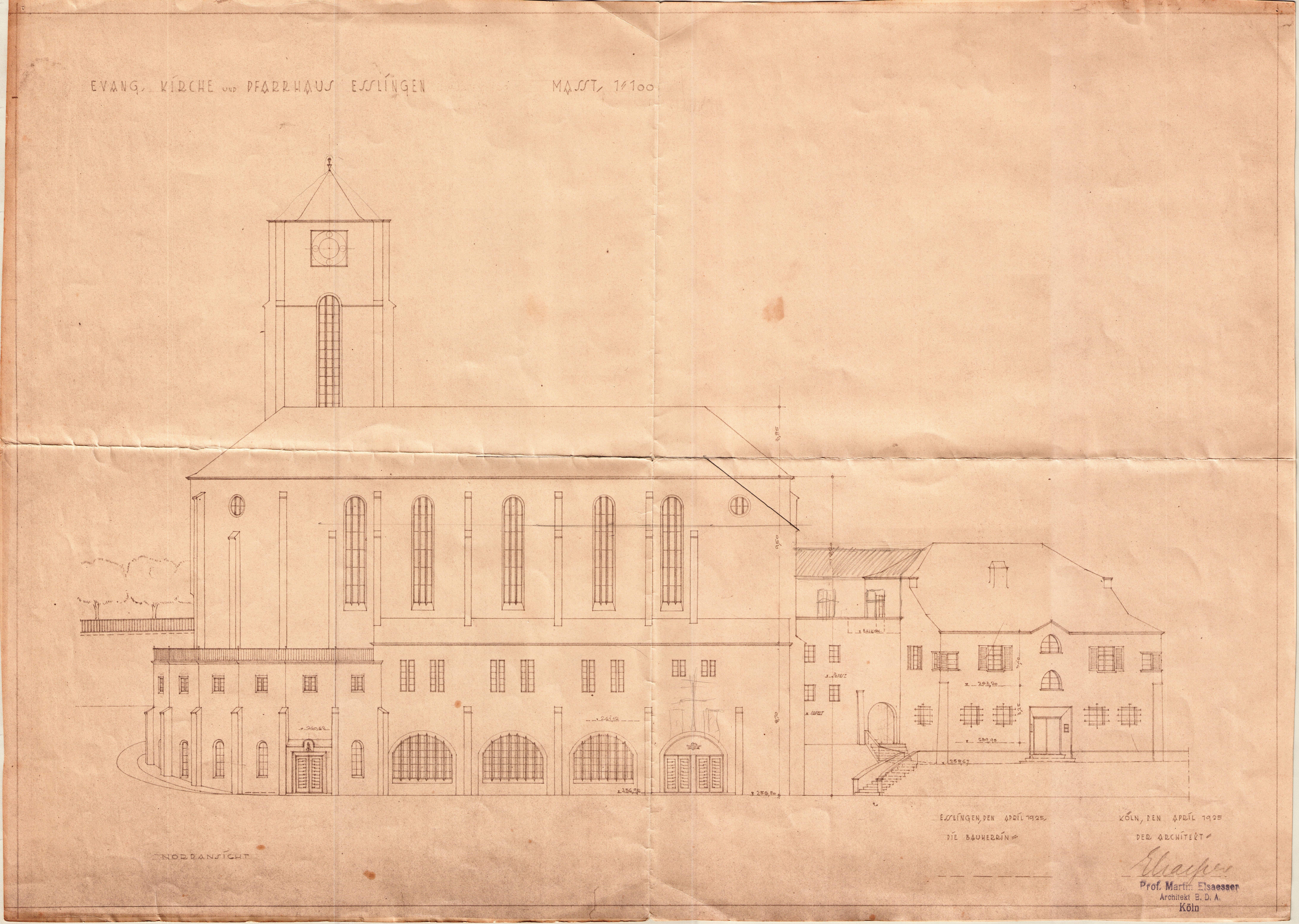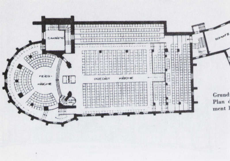 Diese Leitgedanken prägten auch die XXIX. Eisenacher Kirchenkonferenz, in der man auf jegliche formale Festlegung verzichtete und lediglich „ernste und edle Einfachheit in Gestalt und Form“ im Rahmen eines einheitlichen Ganzen forderte.(27) Die Stilfrage blieb vollkommen offen, man empfahl lediglich die Konzeption eines auch im Außenbau sichtbaren Chores für die Feier des Abendmahls, für Konfirmationen oder Trauungen, ohne dies aber in irgendeiner Form vorzuschreiben. Die Stellung von Altar und Kanzel wurde darüber hinaus gar nicht thematisiert und auch die Frage der Platzierung von Orgel und Sängerchor allenfalls vage behandelt.(28) Beim Westdeutschen Kursus für Kultus und Kunst in Marburg 1924 hielt Martin Elsaesser ein Referat, dessen Thesen als „scharfe Thesen“ in die Kirchenbaugeschichte eingingen.(29) Elsaesser kritisierte, dass es aufgrund eines nie klar definierten Raumideals der evangelischen Kirche noch immer keinen Typus des evangelischen Kirchenbaus gebe und forderte die klare Einräumigkeit mit der Tendenz zur Zentralität unter Wahrung der Trennung zwischen der großen Predigtkirche mit profanem Charakter und der kleinen Feierkirche mit sakralem Charakter. Dieses additive Bauprinzip äußerte sich in seiner Konzeption der Esslinger Südkirche mit einem rechteckigen, lichtdurchfluteten und flachgedeckten Predigtraum, an den sich eine kleine kreisförmige Feierkirche mit überfangendem Rabbitzgewölbe und kleinen, farbig verglasten Fenstern, durch das gedämpftes Licht einströmt, anschließt.(30) Der stimmungsvolle halbdunkle Feierraum steht also in starkem Kontrast zum lichtdurchfluteten Predigtraum, wodurch sich eine zweigliedrige Kirchenform im Sinne einer Kirche als geistige und symbolische Kraft ergibt.(31)