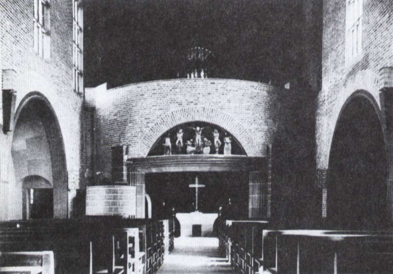Die nach einem Entwurf einer „Kleinen Volkskirche“ von Martin Elsaesser 1925/1926 erbaute Südkirche in Esslingen setzt sich aus einem Predigtraum in Gestalt eines dreischiffigen Longitudinalbaues mit flacher Holzbalkendecke und einem östlich sich anschließenden Feierraum in Gestalt eines gewölbten Rundbaues zusammen, dessen westliche Tangente durch den Anschluss an den Predigtraum konkav eingeschwungen ist.(50) Dieser Bogen ist durch einen kräftig profilierten Rahmen eingefasst und zudem durch zwei kurze Wandpfeilervorlagen hervorgehoben.(51) Unter diesem Bogen steht der sowohl von der Predigt- als auch der Feierkirche zu nutzende Altar, der als Bindeglied zwischen den beiden Raumteilen fungiert. Der Rundbau der Feierkirche, die nicht die Höhe des Predigtraumes erreicht, aber dafür Platz für Empore und Sängerbühne bietet, wird von einer vieleckig gebrochenen Außenmauer umschlossen, wobei zwischen dem Rundbau und dem Polygon ein schmaler Chorumgang vermittelt, der auf der Nordseite die Flucht des Langhausseitenschiffes aufnimmt.(52) Rundbogenarkaden öffnen sich von hier aus in runder Stellung zum Zentralraum hin, der per se nicht direkt beleuchtet ist. Das einzige Licht nämlich fällt durch kleine, stark farbig verglaste Fenster der Außenwände, wodurch sich durch den Umgang ein Lichtkreis ergibt, der den Feierraum von oben her beleuchtet und im Erdgeschoss in diffusem Licht bleibt.(53) Über den Arkaden erhebt sich das Gewölbe, dessen einzelnen Gewölberippen in alternierender Höhe ansetzen, wodurch die Wand mit dem Gewölbesystem verschmilzt. Die dreischiffige, durch Arkaden gegliederte Predigtkirche zeichnet sich durch ungleich breite Seitenschiffe aus. Das nördliche Seitenschiff ist durch drei tiefe, tonnengewölbte Nischen gegliedert, die durch rundbogige Durchgänge miteinander verbunden werden, so dass ein schmaler Laufgang zur seitlichen Bestuhlung des Mittelschiffes entsteht.(54) Das südliche Seitenschiff ist breiter, hier finden sich quergestellte Bestuhlungsreihen, die zur Außenmauer hin ansteigen und durch eine hölzerne Brüstungswand vom Mittelschiff abgetrennt sind. Das Arkadengeschoss zeichnet sich durch breite gedrückte Rundbogenfenster, über denen jeweils zwei kleine Hochrechteckfenster angeordnet sind, während der Obergaden allein durch schmalhohe Rechteckfenster gegliedert ist. Sowohl im Arkadengeschoss als auch im Obergaden werden die großen Fenster von vertikal aufsteigenden Wandvorlagen begleitet, wodurch die Vertikalität der Fassaden trotz des breiten Gesimses zwischen Arkadengeschoss und Obergaden deutlich betont wird. Der gesamte Kirchenbau ist in Backstein ausgeführt, doch hellt eine plastisch hervortretende Horizontalverfugung das Mauerwerk auf und belebt es, je nach Lichteinfall, zugleich. Die verputzten Wände und Decken der Seitenschiffe sind mit einer Schablonenmalerei in Pastelltönen verziert, welche die einzelnen Wände in unterschiedliche Rechtecke auflöst.(55) Die Schablonenmalerei steht in starkem Kontrast zu der kräftig graublauen Farbfassung der Arkadenlaibungen, der Seitenschiffspfeiler und der Altarrahmung, wodurch die einzelnen Gliederungselemente der Raumteile stark voneinander abgehoben werden. Die graublaue Farbgebung zeigt auch die Bestuhlung, hier jedoch in unterschiedlichen Tonwerten, die den Innenraum optisch beleben. Die Expressivität der einzelnen Raumteile durch die architektonische Gestalt von Feier- und Predigtraum wird also durch die jeweilige Farbgebung und Lichtdurchflutung noch umso mehr gesteigert. Die innere Raumpluralität wird indes durch die Komposition des Außenbaues aufgehoben, denn über Predigt- und Feierraum zieht sich ein einheitliches Satteldach, das die beiden Raumteile unweigerlich miteinander verbindet. So wird folglich die Differenzierung der beiden Raumteile im Inneren durch die Zusammenziehung im Außenbau einerseits, aber darüber hinaus auch durch die beidseitige Nutzung von Altar, Orgel und Empore aufgehoben. So steht die unterschiedliche liturgische Nutzung von Feier- und Predigtraum zwar deutlich im Vordergrund der Raumkonzeption der Esslinger Südkirche und doch sind auch raumverbindende Elemente erkennbar, die als durchaus zukunftsweisend anzusehen sind.