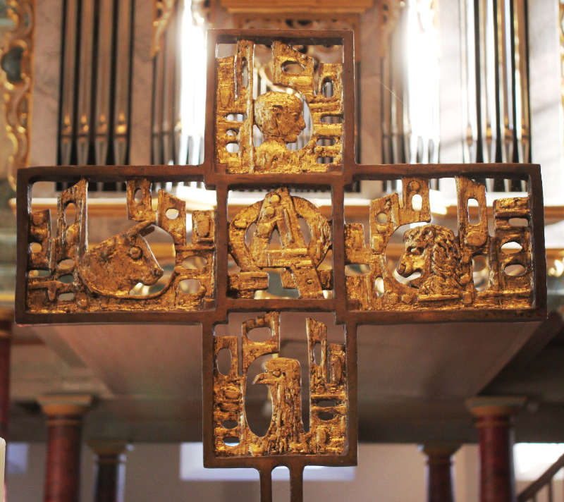 Anstelle des Agnus Dei am Schnittpunkt zwischen Kreuzstamm und Querbalken tritt im Tischkreuz von Ingrid Seddig in der Fellbacher Lutherkirche von 1971 das Alpha und Omega als Symbol für Christi im Sinne von „der Erste und der Letzte“.(67) Die beiden Buchstaben sind einem Quadrat einbeschrieben, um welches sich vier Rechtecke mit den Evangelistensymbolen gruppieren. Die Rahmen sind durch Überschneidungen miteinander verkettet und in der Senkrechten hochrechteckig, in der Waagrechten hingegen querrechteckig geformt. Die Anordnung der Evangelistensymbole gleicht derjenigen im Werk Yelins, gänzlich verschieden ist indes die künstlerische Gestalt insofern, als nun das flache Relief durchbrochen ist, so dass man zwischen der jeweiligen Rahmenform und zwischen den die Evangelistensymbole umgebenden Formen hindurchblicken kann. Zudem sind nun hier alle Binnenformen vergoldet, wodurch die einzelnen Symbole gegenüber der jeweiligen Rahmenform noch umso deutlicher hervorgehoben werden.