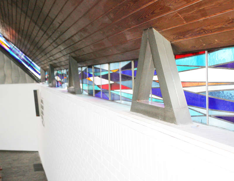 Eine gänzlich davon differierende Auffassung von Glasmalerei bzw. Kunstverglasung zeigen die nach dem zweiten Weltkrieg errichteten Kirchen, die nun nicht mehr notwendigerweise durch herkömmliche Fenster, sondern durch Lichtstreifen beleuchtet werden, wie es beispielsweise die Melanchthonkirche in Fellbach zeigt, die 1962/1964 nach den Entwürfen von Anneliese Paulus mit farbigen Lichtstreifen ausgestattet wurde.(89) Die farbigen Lichtstreifen des Kircheninneren verlaufen auf der Nord- und Südseite entsprechend des Giebels dreieckförmig, auf den Langseiten horizontal. Sie sind in ihrer Farbgebung auf den Altar hin ausgerichtet und weisen somit dort die hellsten Farben auf. Während das Lichtband der Nordseite in Grauweiß gehalten ist, dominiert in den horizontalen Lichtstreifen die Farbe Blau in verschiedenen Schattierungen, unterbrochen von Rot, Gelb und Weiß. Die Südseite, also die Altarseite, zeigt von unten nach oben ansteigend die Farben Blau, Rot und Gelb in wiederum verschiedenen Farbnuancen. Die oberste Spitze erstrahlt in hellem Gelb und suggeriert dadurch die Vorstellung, als erschiene der Heilige Geist über dem Altar und somit über allen, die dem Gottesdienst beiwohnen.