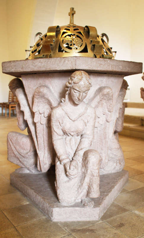 Dies zeigt sich an der Gestaltung der Taufsteine und Taufbecken, die in ihrem Formenreichtum zunehmend reduziert werden. So zeigt beispielsweise der von Wilhelm Jost 1926/1927 für die Fellbacher Pauluskirche entworfene, der Gesamtkonzeption des Innenraumes in den Formen des Jugendstils entsprechende Taufstein noch ein kompliziertes Gebilde, bestehend aus einer sechsseitigen Sockelplatte, dem Korpus, der Deckplatte und einem halbkugelförmigem Deckel.(74) Die Sockelplatte hat im Prinzip die Form eines Dreiecks mit abgeschnittenen Ecken, der Korpus strahlt von der Mitte der Sockelplatte ausgehend sechsförmig aus und öffnet sich nach oben hin zu einem regelmäßigen Sechseck, auf dem eine sechseckige Deckplatte aufliegt. Den schmalen Seiten der Sockelplatte sind ebenso wie beim Altar drei kniende betende Engel aus Terrakotta mit gesenkten Häuptern vorgelagert, die gleichsam als Stütze des Korpus fungieren. Die Deckplatte ist zweifach gestuft. In der Mitte befindet sich eine kreisförmige Einwölbung zum Einstellen einer Schale, die äußere Abstufung ist ebenfalls kreisförmig, jedoch flach gehalten und dient dem Aufsetzen des gewölbten Kupferdeckels. Dessen Oberseite ist vergoldet und durch sechs Bänder in sechs offene dreieckförmige Felder eingeteilt, die mit den christlichen Symbolen Adler, Christusmonogramm, Agnus Dei, Rebe mit Weinlaub, zwei Fischen und Kreuz gefüllt sind. Alle Symbole sind jeweils einem rahmendem Kreis einbeschrieben. Die oberen Zwickel bieten Raum für paarweise einander zugeordneten Öffnungen, die den Blick zum Scheitel des Halbkreisbogens führen, der von einem lateinischen Kreuz bekrönt wird.