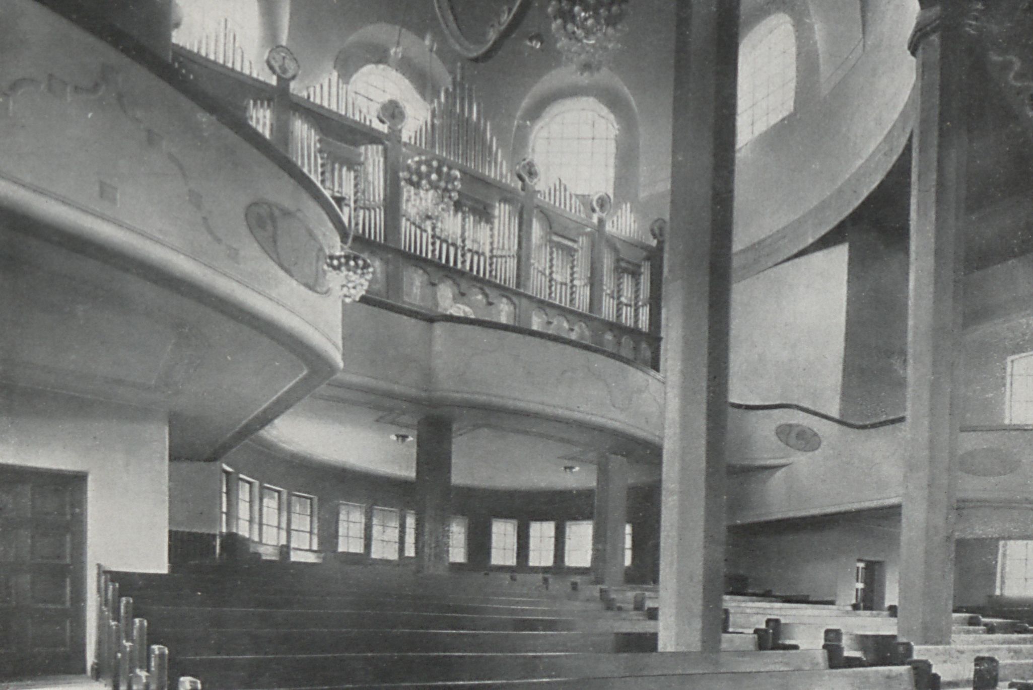 Ulm, Pauluskirche (Garnisonskirche). Innenansicht. Blick nach der Orgel - Lichtrotunde