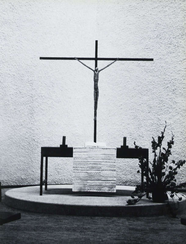 Auch das von Karl Ulrich Nuss 1972 für die Pfarrkirche St. Jodokus in Strümpfelbach geschaffene Tischkreuz zeichnet sich durch die Fragilität des Gekreuzigten aus.(71) Dieser ist einem breiten lateinischen Kreuz einbeschrieben und zwar insofern, als im Schnittpunkt zwischen Kreuzstamm und Querbalken ein Kreis ausgeschnitten ist, in den die Figur des Gekreuzigten eingepasst ist. Der äußerst schmale, grazil wirkende Christus ist nimbiert und überschneidet mit seinen ausgestreckten Armen und Beinen die Tangente des Kreises, während der Kopf die Tangente des Kreises berührt. Durch die Gestrecktheit des Körpers wird er selbst zum Kreuz und ersetzt dieses, das in der Tat schon fortgelassen ist. Trotz der Grazilität der Figur sind die einzelnen Knochen des Körpers und die Falten des Lendenschurzes deutlich artikuliert. Durch den Gegensatz zwischen schmal und breit sowie zwischen eckig und rund wird die Skulptur zu einem besonderen Erlebnis für den Betrachter, der zudem das Symbol des Kreuzes nicht nur in der Gestalt des Kreuzes per se, sondern auch in der Figur des Gekreuzigten und in seinem Nimbus wahrnimmt. Das Symbol des Kreuzes ist also in dreierlei Gestalt wiedergegeben, ein Gestaltungsprinzip, das den Gedanken an die Dreifaltigkeit mit in sich einschließt.