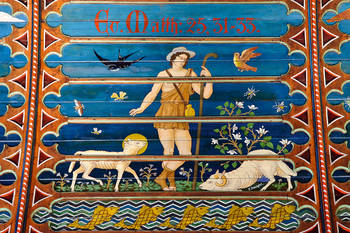 Die Deckenbemalungen nach den Entwürfen von Heinrich Dolmetsch weisen eine Vielzahl an Ornamenten und Motiven mit Lilien, Blüten oder Rosetten, Teppichmustern und Quadern, allegorischen Motiven, Bibelversen und Psalmen, wie beispielsweise in der evang. Kirche in Beuren, wo Dolmetsch 1904 an den senkrechten Bereichen der gesprengten Decke auf der Nord- und Südseite Inschriften anbringen ließ.(77) Die verschiedenen Ornamente wurden meist in Friesbändern, und zwar in der Technik der Schablonenmalerei aufgetragen, um der Gleichförmigkeit der Ornamente Rechnung tragen zu können. Die friesartige vegetabile Ornamentmalerei zeigt sich neben Beuren und Uhlbach auch beispielsweise in der evang. Kirche in Bad Herrenalb, wo die Decke des Kirchenschiffs nicht spitz, sondern kleeblattförmig gesprengt ist und sich hier ein mittleres Fries durch das gesamte Kirchenschiff zieht.(78) Figürliche Elemente wie in der Andreaskirche in Uhlbach kommen auch in der evang. Kirche in Oberrot vor, für die Heinrich Dolmetsch 1887/1888 auch die Malerei für das Tonnengewölbe im Turmchor entwarf.(79) Das Figurenprogramm nimmt in Gleichnissen Bezug auf das Jüngste Gericht und zeigt auf der Nordseite von Osten nach Westen einen Schnitter, Christus als Weingärtner und den Sämann. Auf der gegenüberliegenden Seite sind Schafböcke unter einer Palme, die Scheidung der Böcke von den Schafen und der Widder unter dem Paradiesbaum zu sehen.(80)