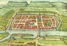 Stadtansicht Heilbronns von Westen. Kolorierter Kupferstich aus Civitates Orbis terrarum, 1617