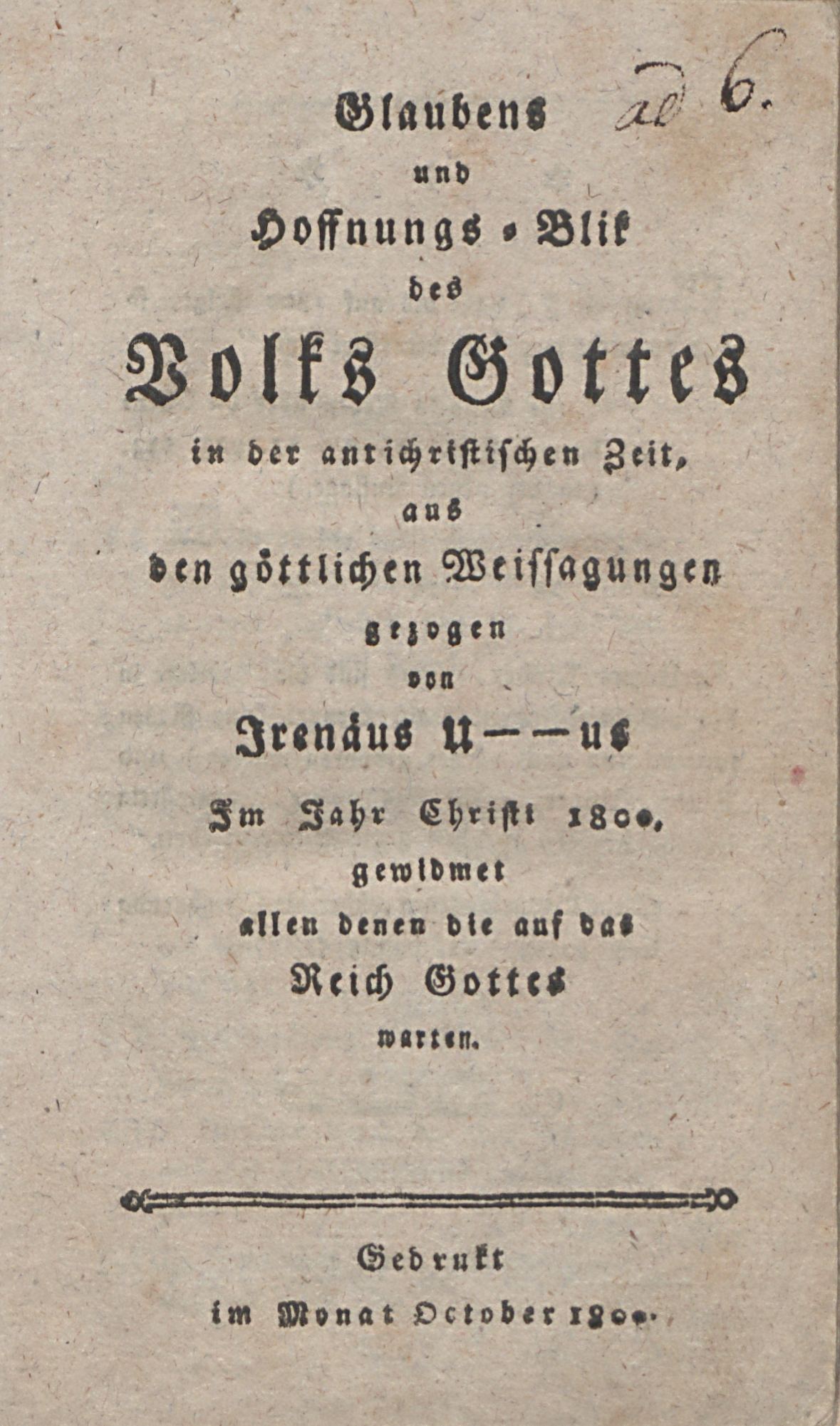 Titelblatt der 1. Auflage von JOHANN JAKOB FRIEDERICHs im Jahr 1800 anonym erschienener Schrift „Glaubens und Hoffnungs-Blik“. Ein Werk, das die Auswanderungsbestrebungen stimuliert hat.