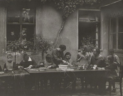 Kinder der Heil- und Pflegeanstalt Stetten beim Korbflechten, um 1900