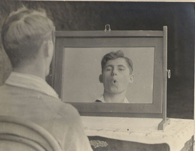 Lautierender Taubstummer am Spiegel, Taubstummenanstalt Wilhelmsdorf, um 1920